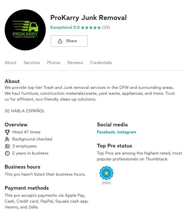 “I recently hired ProKarry for removal of construction debris at your remodel and was thoroughly impressed. Their professionalism and clear communication made the process smooth, and they completed the job on time at a competitive price. I will definitely use them again and highly recommend their services!”